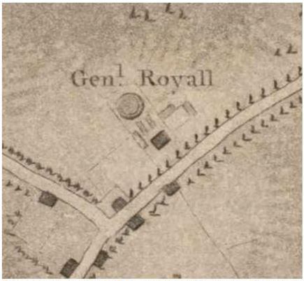 In the inventory that was taken of Isaac Royall Jr.’s estate which was in 1778, and this is a small detail of the Pelham map of the Boston area from 1777 in which Mr. Pelham, for the benefit of the English laid out all of the roads and fortresses and so on to help with the American Revolutionary struggle. But you see, the dark rectangle in the front, I assume must be the house. I truly believe that the building to the left of that is the slave quarters in their current configuration on the outside, at least, and then the others are the various buildings associated with the farming operation.